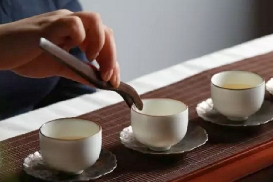 The teaspoon used in tea ceremony is shaped like a stick more than a spoon, with its one end slightly curved. It is mainly used to move dry tea leaves from the tea holder or tea scoop into the teapot, and to dig out brewed tea leaves from the teapot.